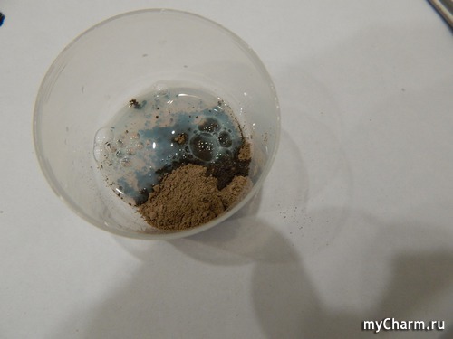2. Открыла пакетики, аккуратно обрезав уголочек ножницами. Влила в плошку небольшое количество (1:2) порошка и проявителя. (Решила что всё сразу выливать не буду, зачем мне так много краски!?) Закрыла пакетики канцелярским зажимом и сложила обратно в коробочку от краски, до следующего раза. Всё это дело размешала зубочисткой до однородной массы. Краска сразу потемнела.