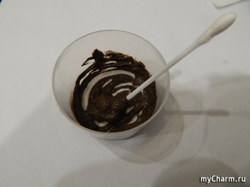 Содержимое двух пакетиков нужно перемешать, в результате чего получится довольно густая кашка. В коробочке не было лопаточки для смешивания краски, я использую кисточку для ресниц, которой потом и буду наносить краску.
